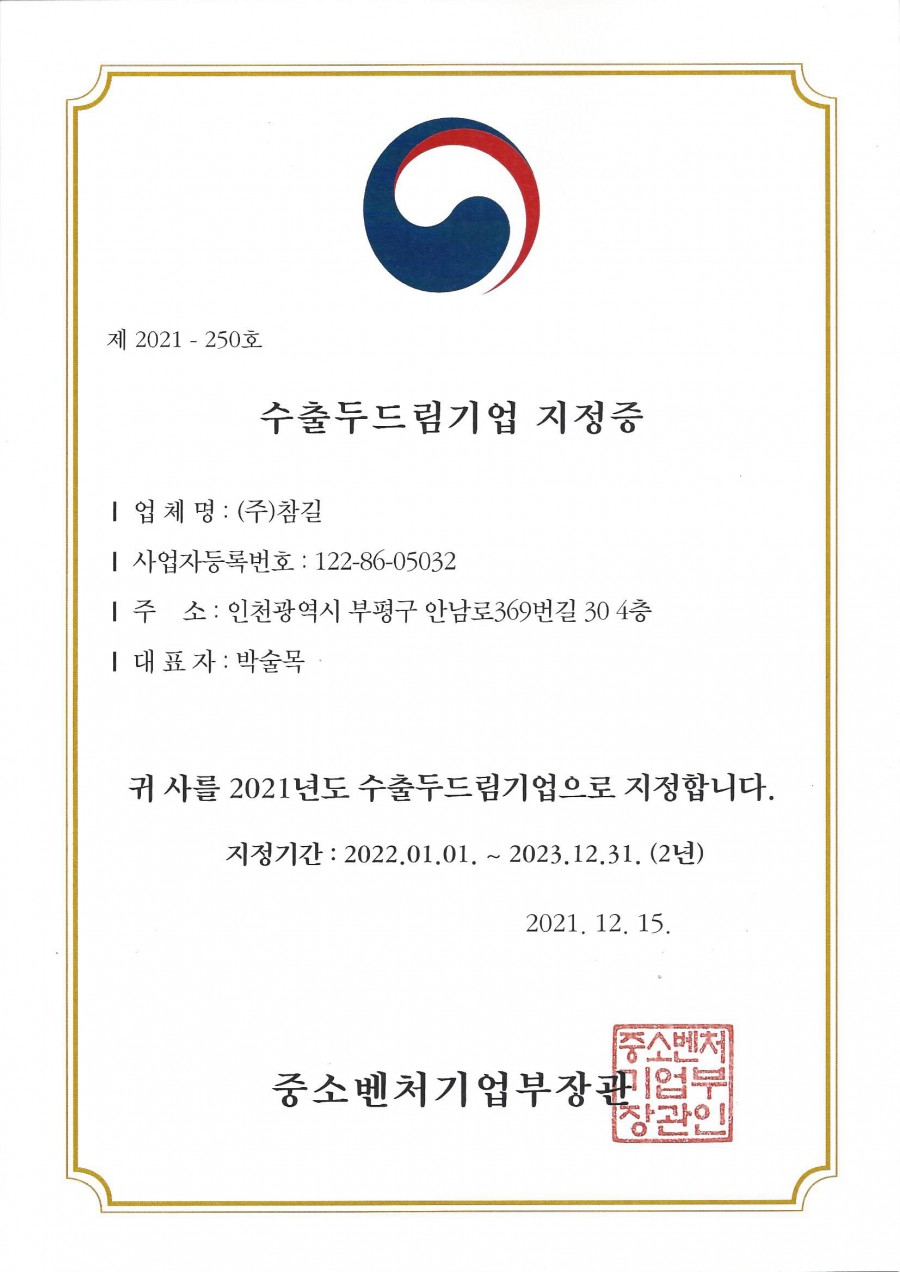 참길 수출두드림기업지정증 페이지 정보 작성자 최고관리자 작성일22-01-13 15:04 조회31,061회 댓글0건 관련링크 본문 저희 참길이 수출두드림기업에 지정되었습니다. 댓글목록 등록된 댓글이 없습니다. 이전글 다음글 목록