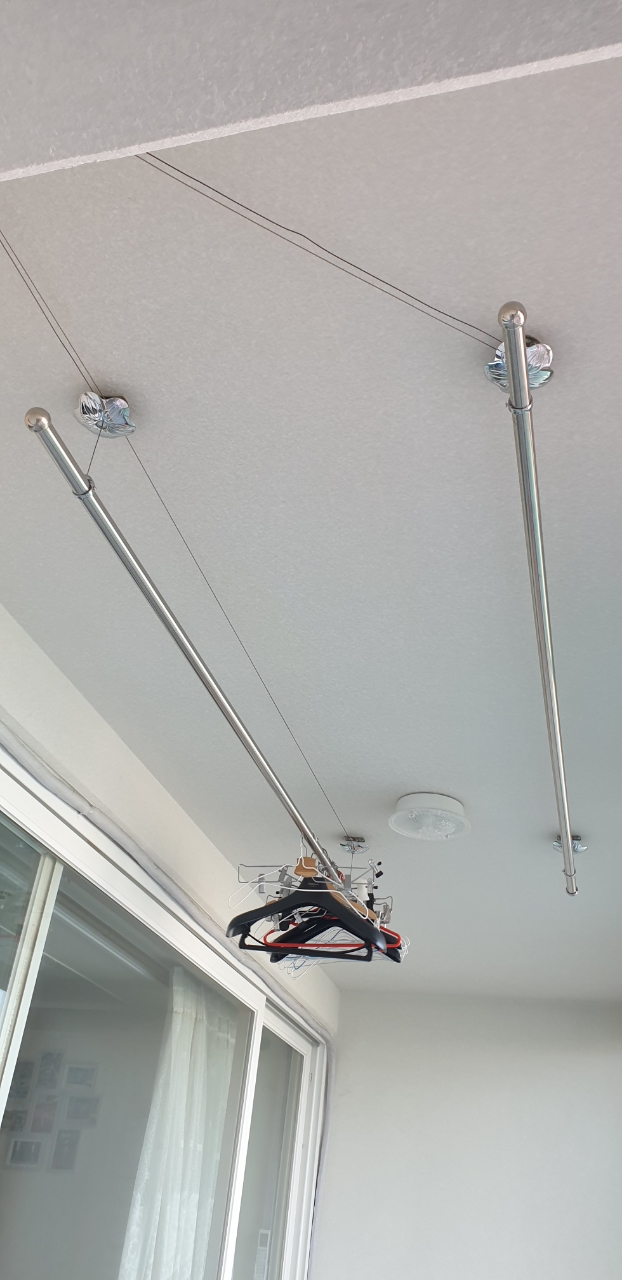 설치해주신 기사님 말씀에 의하면 50KG까지 버티는 와이어라고 하니, 그정도까진 아니더라도 실제 빨래건조시에는 불안하지 않을 것 같습니다.